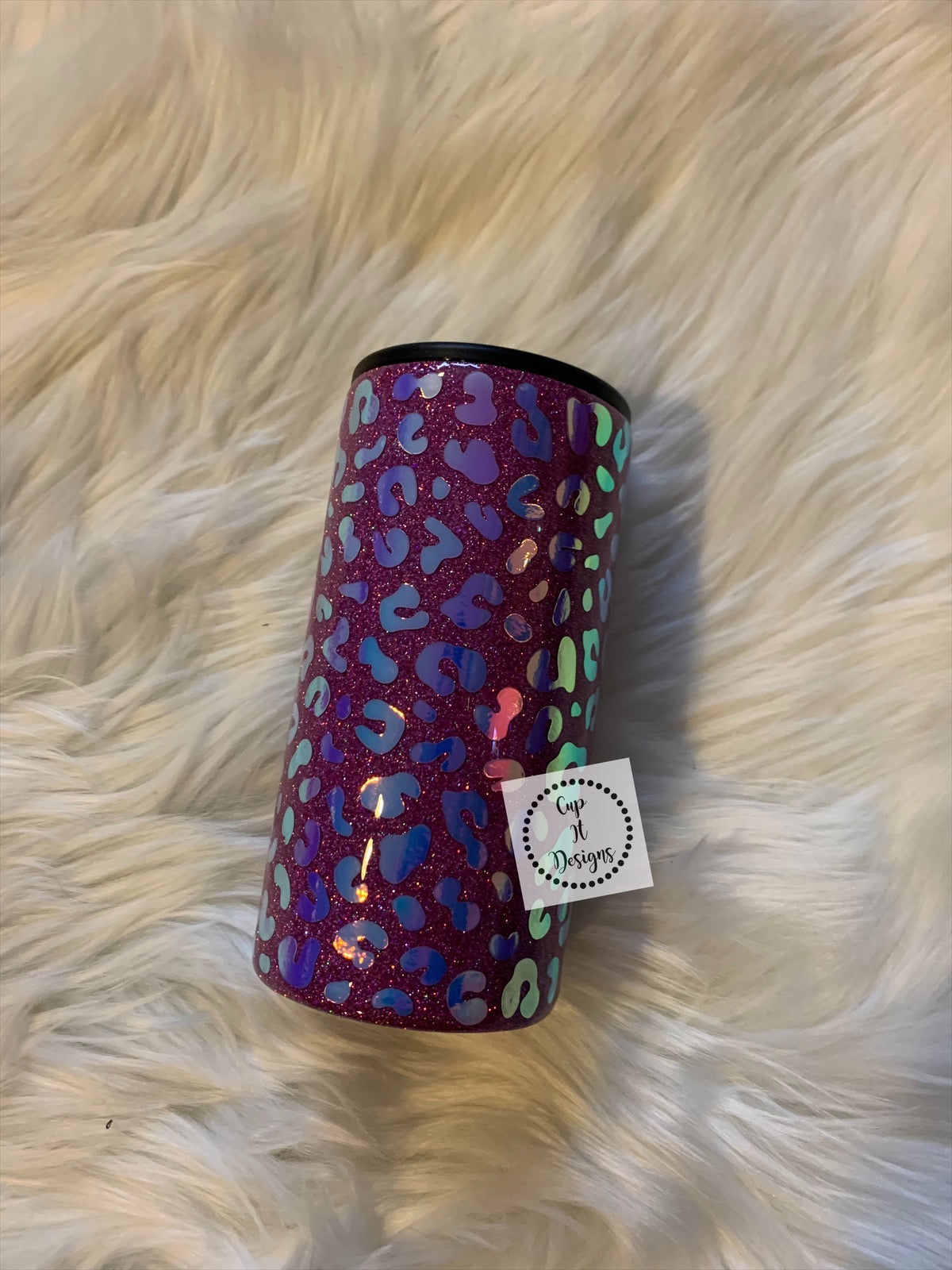 Lavender glitter base with iridescent cheetah decal.